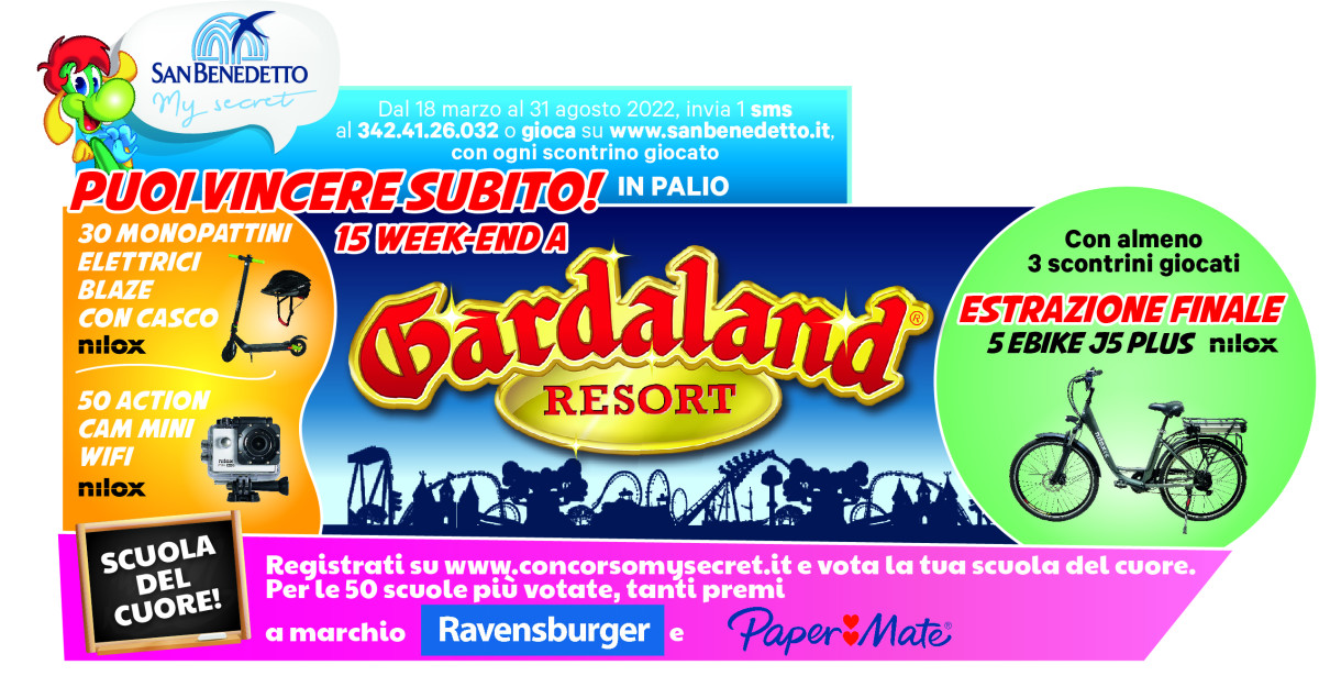 Ogni mese vengono messi in palio decine di premi instant win, ottenibili giocando i dati dello scontrino tramite web, registrandosi al sito www.concorsomysecret.it , o inviando un sms. Inoltre, è prevista un’estrazione finale di 5 superpremi tra tutti coloro che hanno giocato almeno tre volte. Voglia di intrattenimento, desiderio di mobilità sostenibile e divertimento saranno soddisfatti: Acqua Minerale San Benedetto mette infatti a disposizione dei partecipanti 16 week end per quattro persone a Gardaland Resort, 50 Action Cam mini wifi 3 Nilox e 30 monopattini elettrici Blaze Nilox dotati di casco. A questi si aggiungono 5 ebike J5 Plus Nilox, in palio nell’estrazione finale.